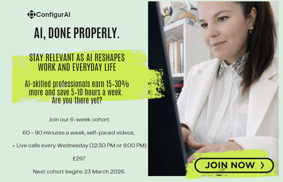 By the end, the goal is simple: Not that you “know about AI.” But that you’ve built a working system around it that genuinely helps you think better, work faster, and stop feeling behind.